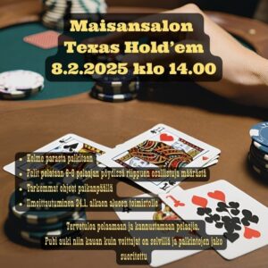 Maisansalon Texas Hold’em tapahtuma helmikuussa, laittakaa tapahtuma muistiin ja tulkaa paikalle pelaamaan tai kannustamaan pelaajia.