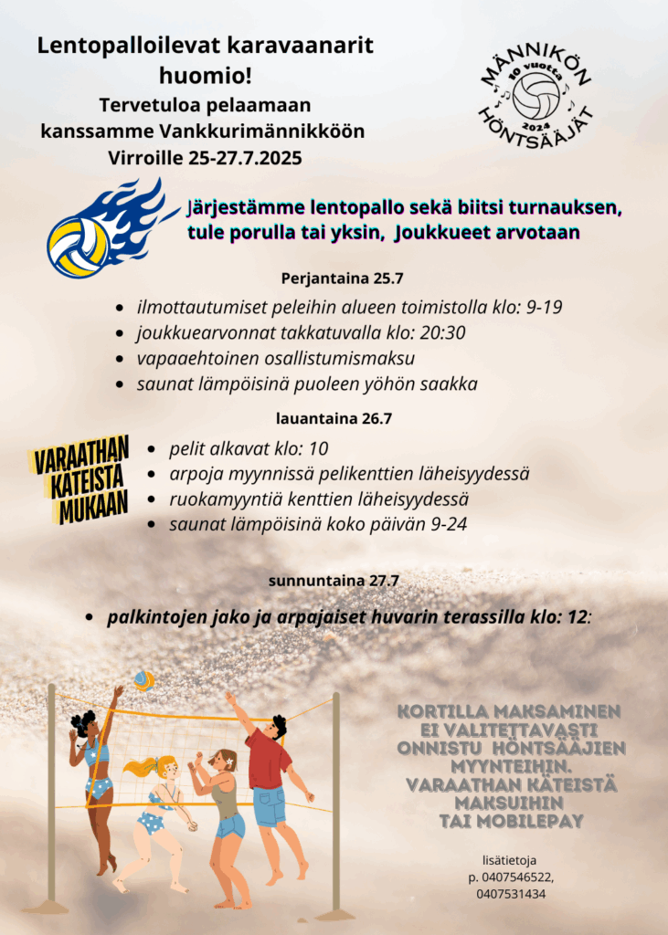 Joukkueet arvotaan perjantai iltana. Lentopallopallopelit alkavat lauantaina klo 10.00.